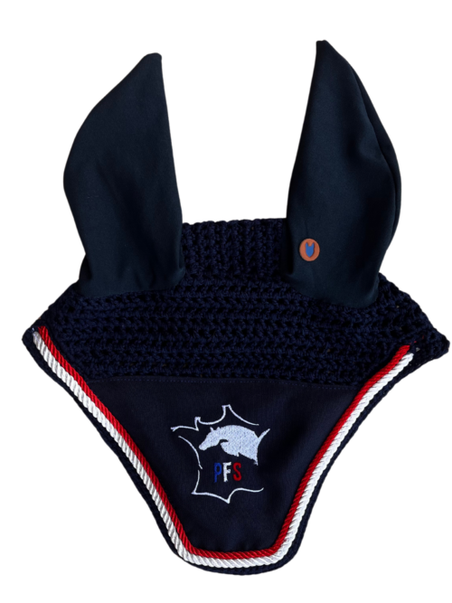 Ensemble assorti comprenant un tapis de selle matelassé et un bonnet anti-mouches brodé aux couleurs de l’ANPFS.
